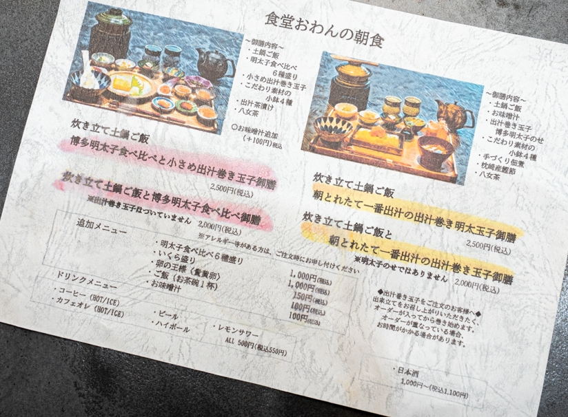 朝7時30分から10時まで楽しめる朝食は、『炊き立て土鍋ご飯と博多明太子食べ比べ御膳』(2,000円)と『炊き立て土鍋ご飯と朝とれたて一番出汁の出汁巻き玉子御膳』(2,000円)が基本メニュー。