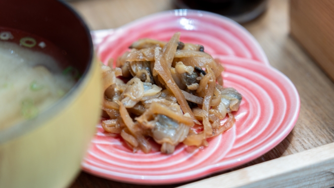 手づくりの佃煮はあさり・紫蘇・エリンギの佃煮で、あさりの歯ごたえと生姜のシャープな辛みがアクセントとなっています。