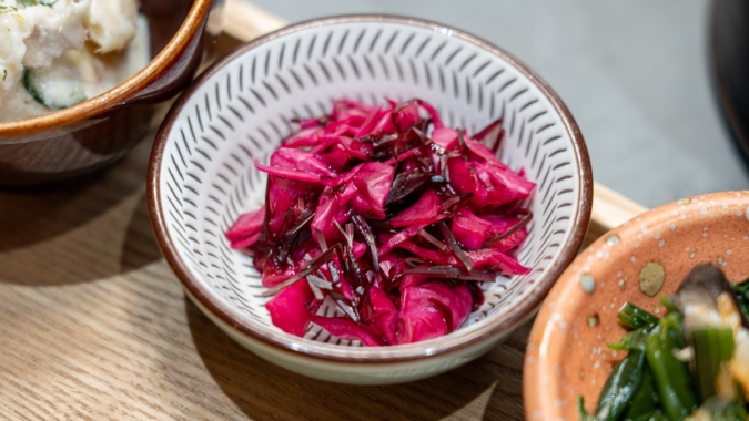 この日はそのほか、甘みと酸味のバランスが絶妙な『紫キャベツと昆布の甘酢漬け』、なめらかな口当たりの『ポテトツナサラダ』、ほっと落ち着く味わいの『厚揚げのナムル』をいただきました。