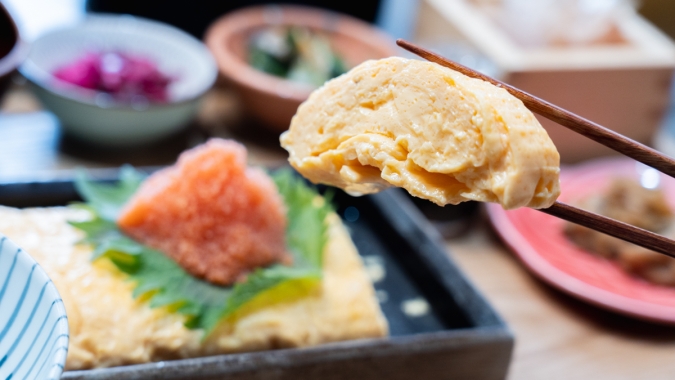 出汁巻き玉子は、福岡県・鞍手町のブランド卵『貴黄卵(きおうらん)』3個分が使われた、ボリュームのある一品。