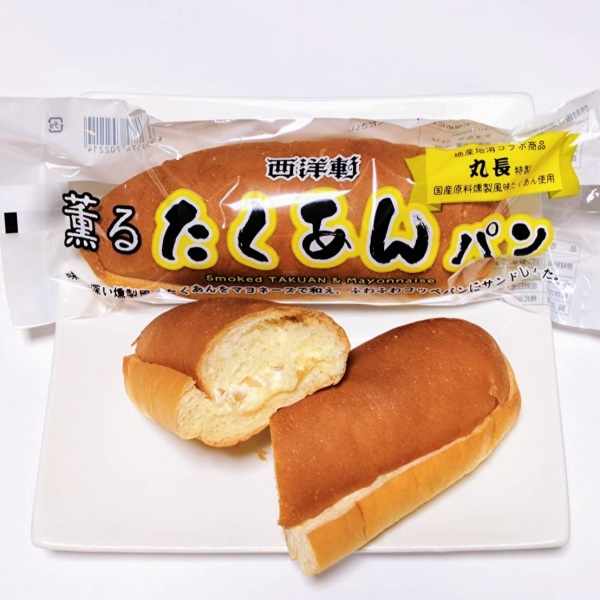 ふわふわとしたコッペパンに、マヨネーズで和えた味わい深い燻製風味のたくあんがサンドされています。