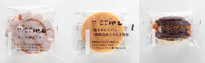 兵庫県【ニシカワ食品】「にしかわフラワー」(320円)、「焼きカレーパン(淡路島産たまねぎ使用)」(220円)、「アベック」(220円)