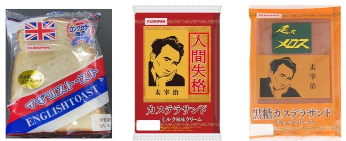 青森県【工藤パン】「イギリストースト(ジャリジャリMAX)」(260円)、「人間失格カステラサンド」(360円)、「走れメロス黒糖カステラサンド」(360円)