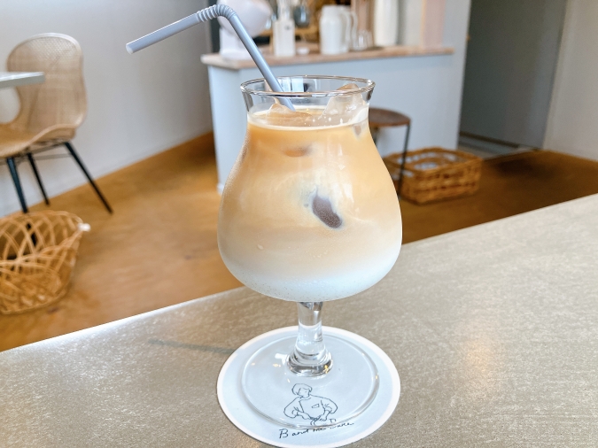オシャレなグラスに注がれた『カフェオレ(ICE)』(イートイン605円、テイクアウト594円)。