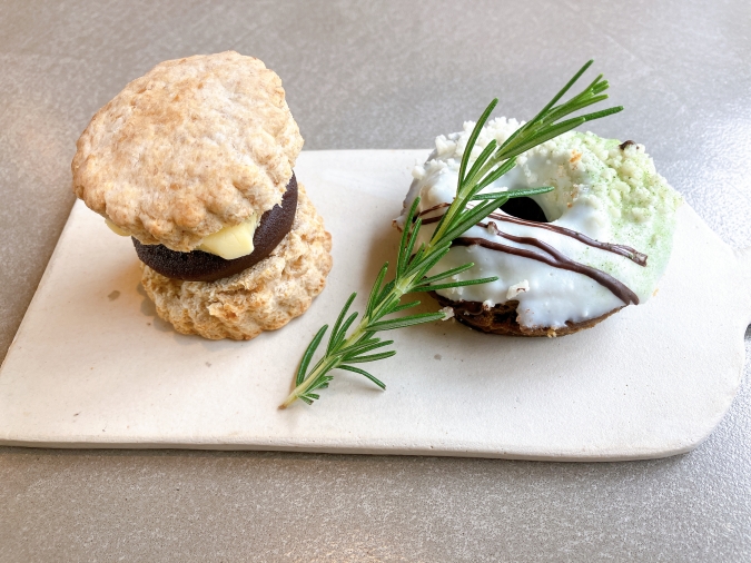 こちらは、左が『あんバタースコーンサンド』(297円)、右が『チョコがけドーナツ(ホワイトチョコ抹茶)』(264円)。