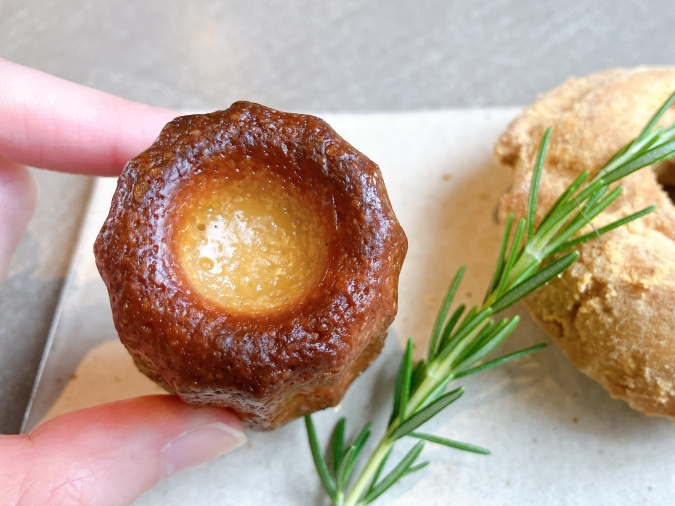 まずはツヤのある美しい『プレーンカヌレ』。外はカリッと、中はもっちりした食感。香ばしさと甘い香りがたまりません♡
