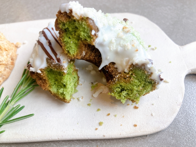 『チョコがけドーナツ(ホワイトチョコ抹茶)』は、サクサクの抹茶ドーナツにホワイトチョコがかかっています。割ってみると中は濃い緑色。抹茶とホワイトチョコの相性が抜群で、とてもおいしかったです。