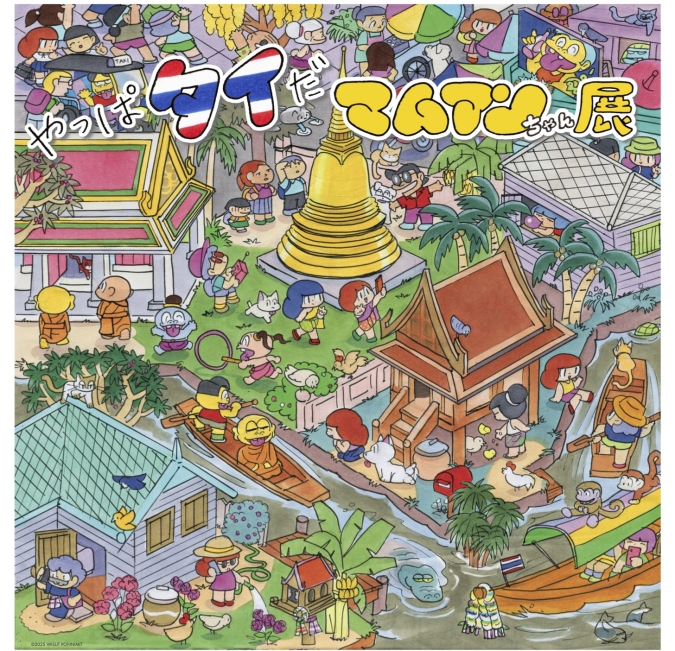 タイ国政府観光庁発行の『マムアンちゃんと巡るタイのガイドブック』の原画や、本展のために制作された完全新作イラストを展示。