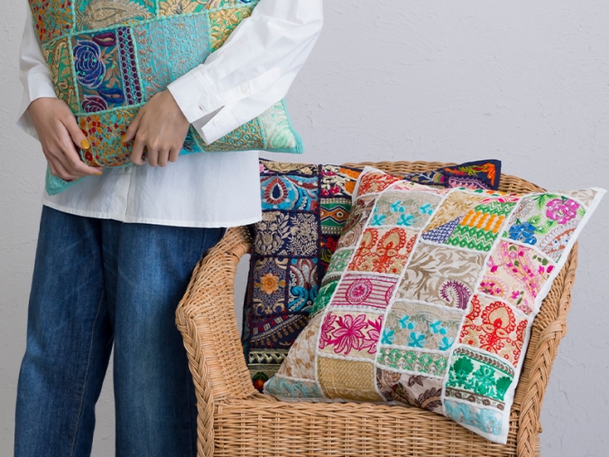 インド「ZAKANAKA+」サリーパッチワーククッションカバー(各2,200円)