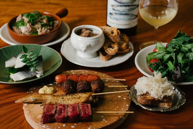 串焼きは鶏、牛、魚介類、野菜、田楽などをちょっぴりヨーロピアン仕立てに。ほかにも、ヘルシーでお酒も進むメニューがたくさん揃います。
