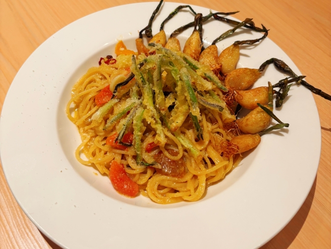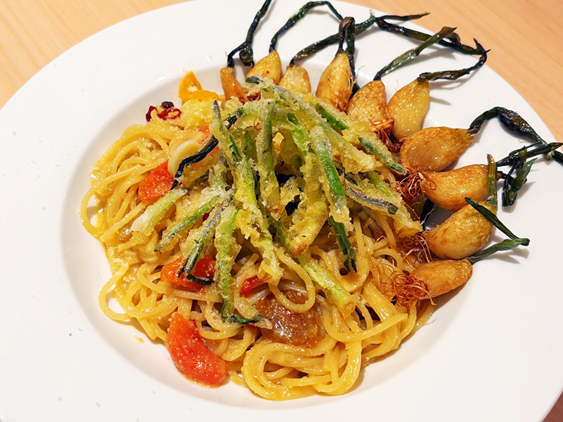 「スプラウトにんにく」1玉分の素揚げに、シャキシャキ食感がクセになる葉部分のかき揚げをトッピング。にんにくの濃厚な風味と食感がたまらない、背徳感たっぷりのパスタですが、「スプラウトにんにく」だから思いっきり食べられます。