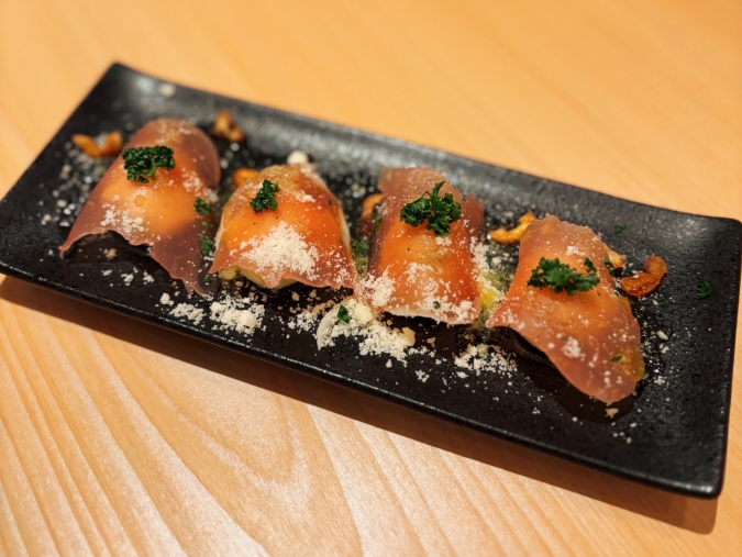 にんにくの風味香るクリーミーなポテトサラダを生ハムで包んだ、酒のアテになる新感覚のポテトサラダ。アクセントにガーリックチップを加えた、食感も楽しい一品です。