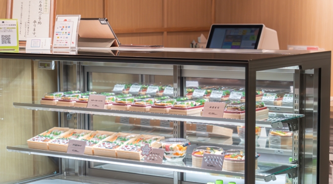 店内のガラスショーケースには、握り寿司やちらし寿司など、見た目にも華やかな6種類の商品が並びます。