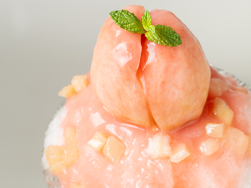 氷には自家製の桃ジャムとシロップをたっぷり染み込ませ、中にはとろけるクリームが隠れています。トップにはカスタード入りのまるごと桃がのっており、贅沢気分が味わえます♡