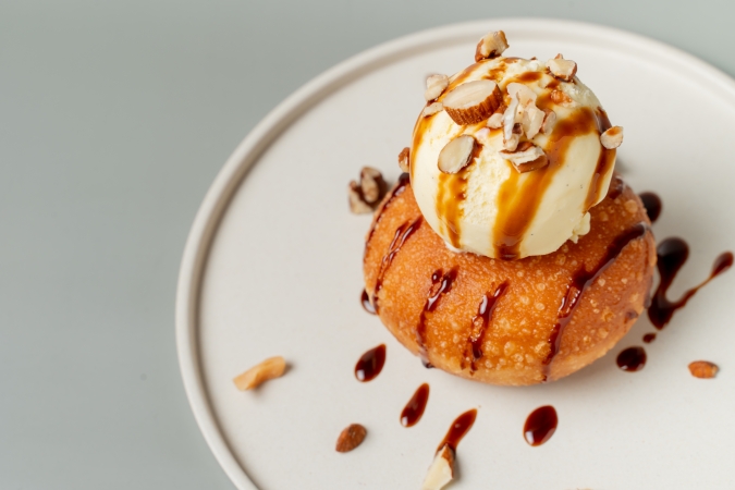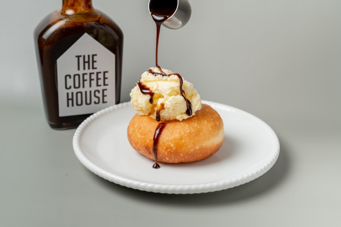 冷たいバニラアイスにふんわりミニドーナツを添え、コーヒーソースをとろりとかけた逸品。
