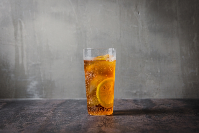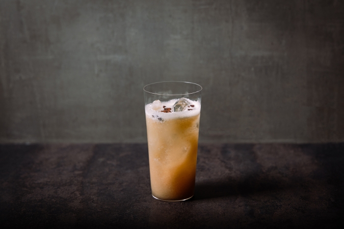 低温で抽出した八女茶を日本酒『飛鸞 Reborn』と炭酸で割ったオリジナルハイボールで、煮出したパッションフルーツの酸味とともに、二層の味わいが楽しめます。