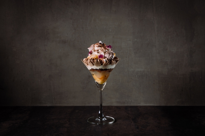 8月の限定パフェ「桃とペルーカカオの夏のビーントゥバーチョコレートパフェ」