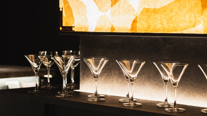 行灯(あんどん)を模したカウンターバックの光壁には、京都の和紙職人が手がけた「不燃和紙」が貼り込まれています。