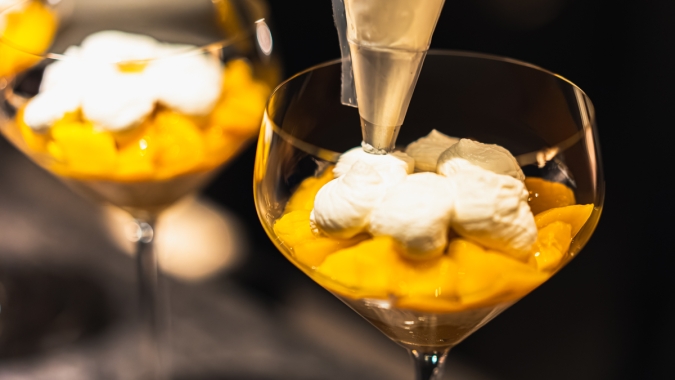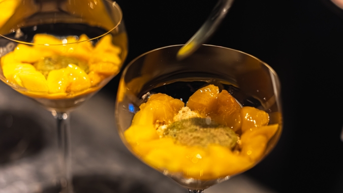 クランブルの上からグラスに沿うように敷き詰められるのが、宮崎県産の完熟マンゴー『太陽のタマゴ』。