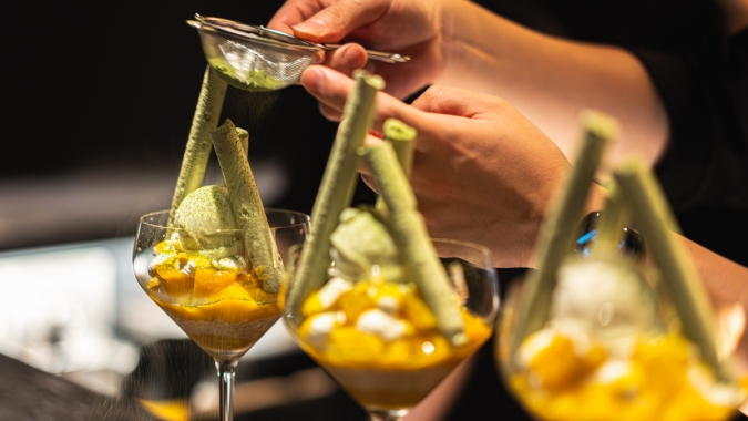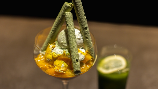 メレンゲには農薬不使用の希少な抹茶を使用。シュワッと軽やかな食感とともに、深みのある抹茶の香りが広がり、ジェラートやマンゴーの甘みに奥行きを与えてくれます。