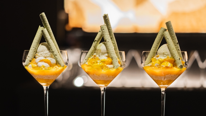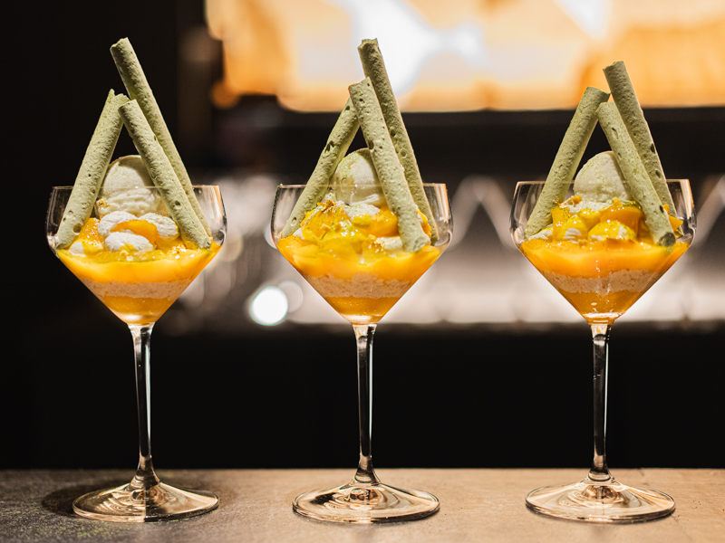 完成されたパフェは、濃密なマンゴーやジェラートの贅沢な甘さに、お茶の香り高い余韻が清涼感を添える、極上のスイーツです。