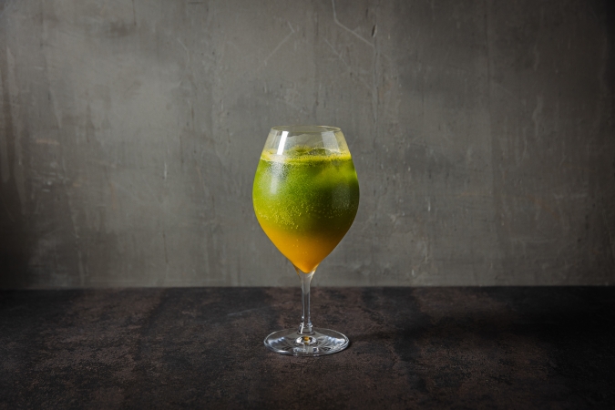 『日本茶とマンゴーのティラミスパフェ』に合わせた2種類のペアリングカクテルのひとつが、『八女茶のエスプーマと貴醸酒のパッション利休ハイボール』(1,430円)。