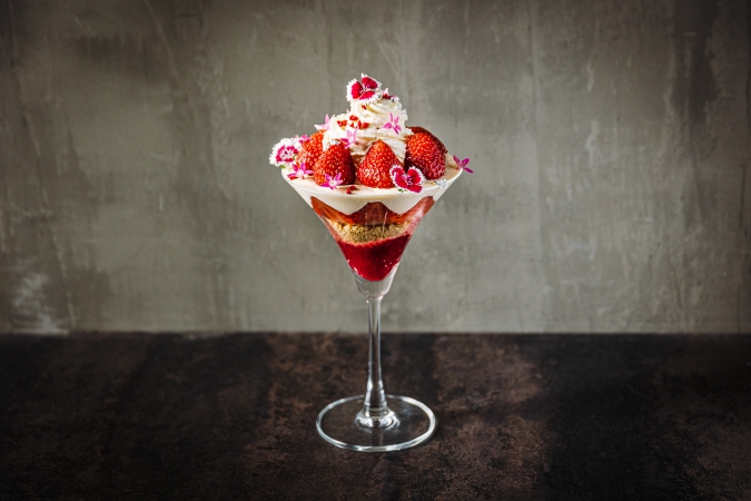 コンクール受賞のスペシャリテ「イチゴの花畑パフェ」