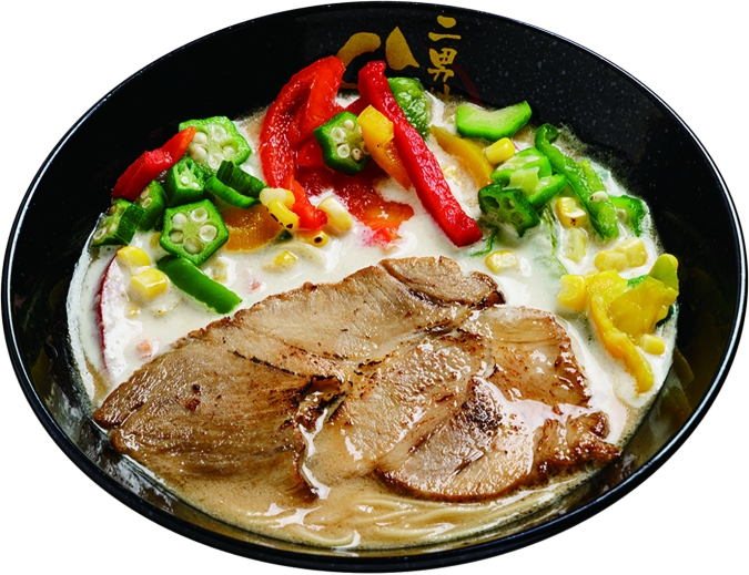今回、創業時から話題を集めた二男坊の代名詞「亜細亜」がリニューアル復活! 『ココナッツ豚骨 亜細亜らーめん 〜栗豚チャーシュー〜』(1,200円)は、ココナッツミルク×スパイスを豚骨スープと融合。グリーンカレーのようなエスニックな味わいで、ピリリとクセになる強さが魅力です。