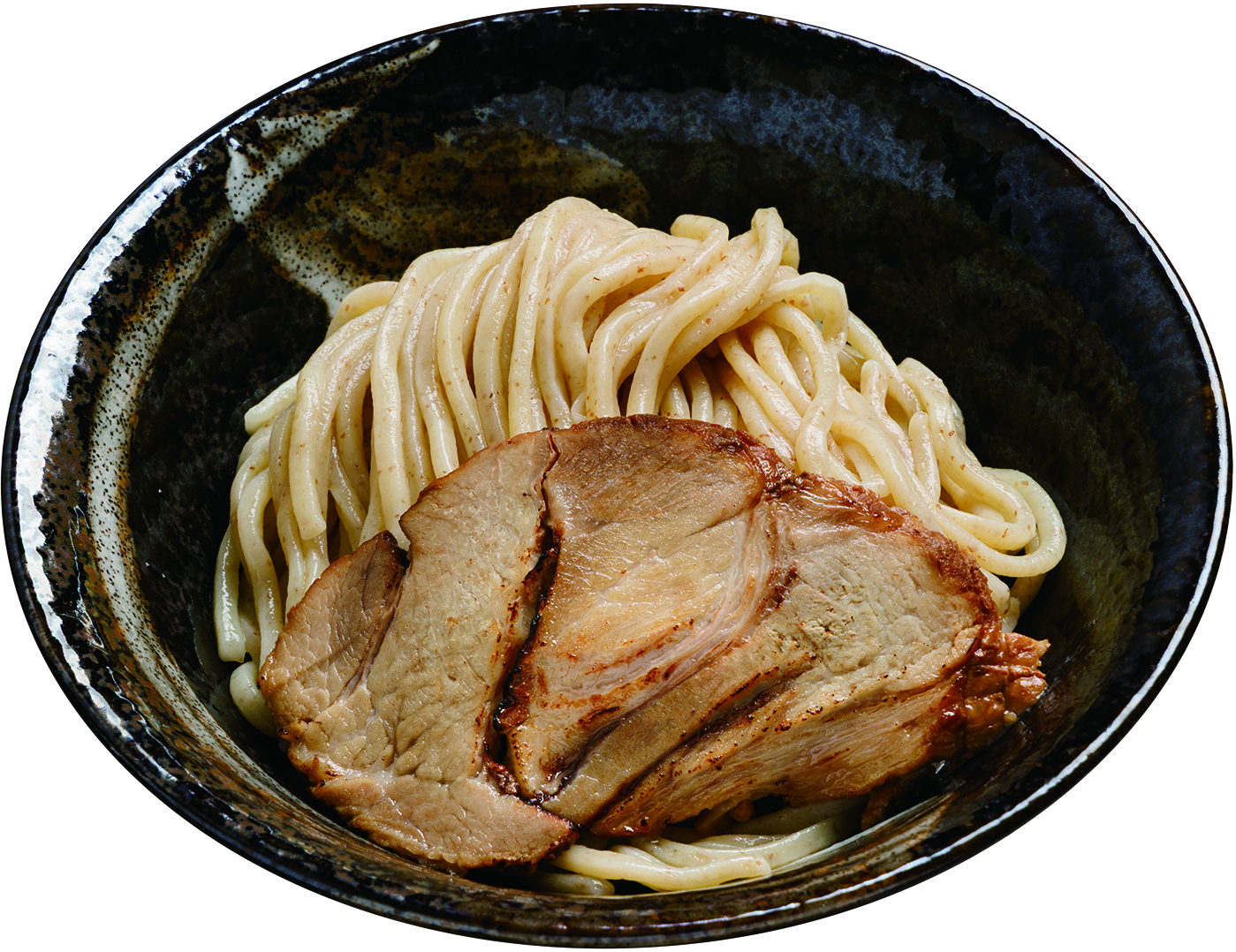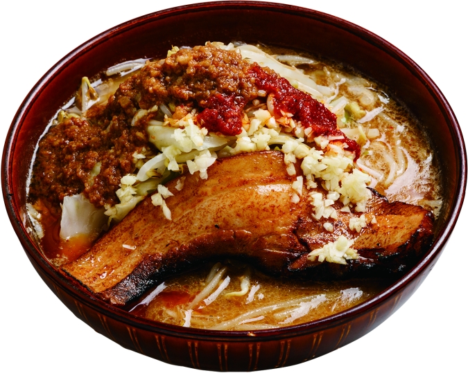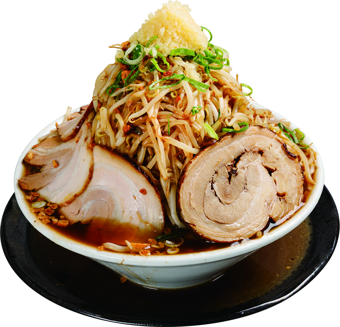 7種類の雑穀粉をブレンドした平打極太麺と極厚国産豚バラ焼豚、山盛炒め味付けもやしを、特製辛味噌つけダレにつけて、豪快にすすります。“食べんといかん”一杯です。