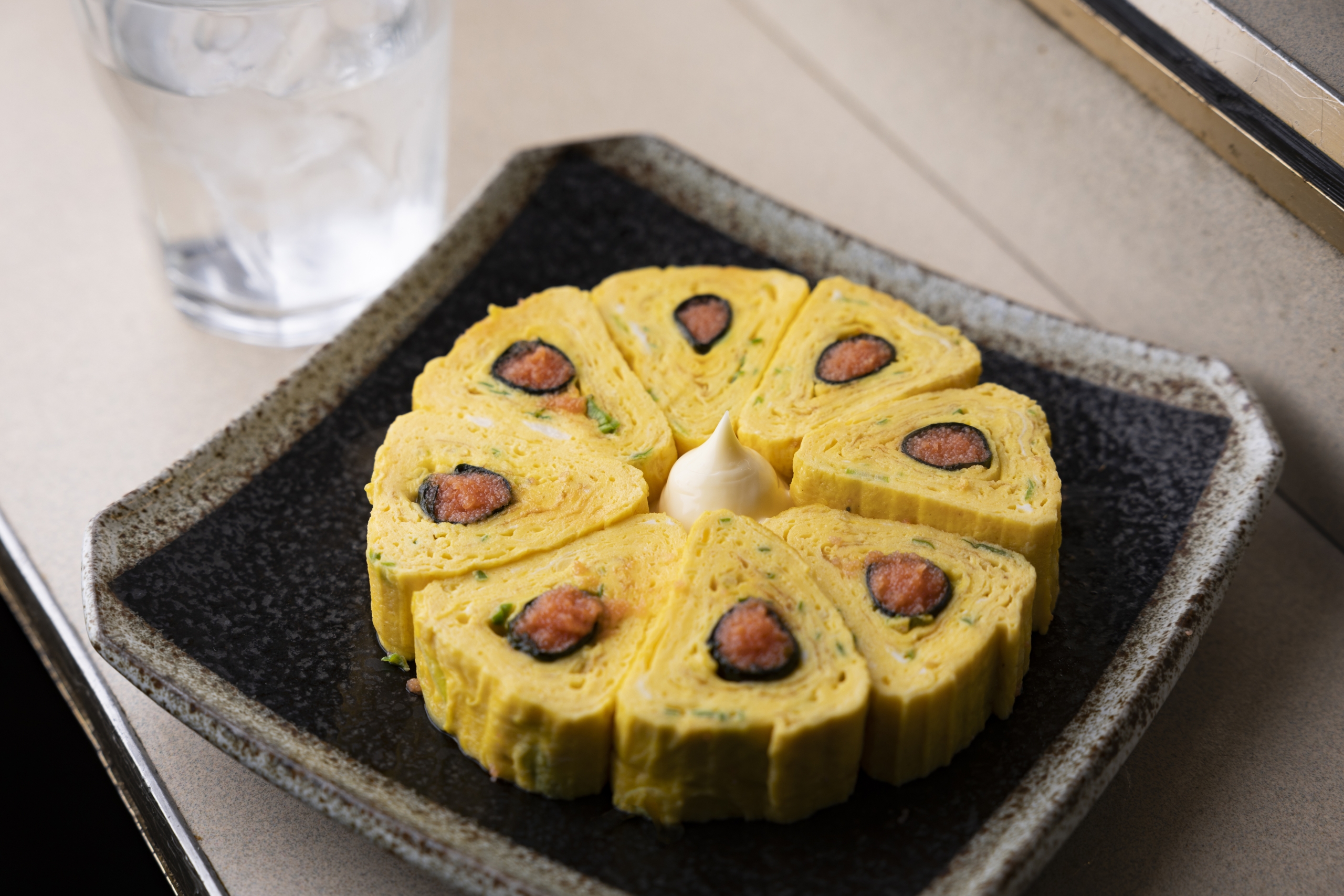 名物は職人技で焼き上げられ、盛り付けも目を引く『明太子玉子焼』(800円)。ほか、『焼き鳥』(各150円~)や『餃子』(500円)、『ホルモン炒め』(1,000円)といった一品メニューが並びます。