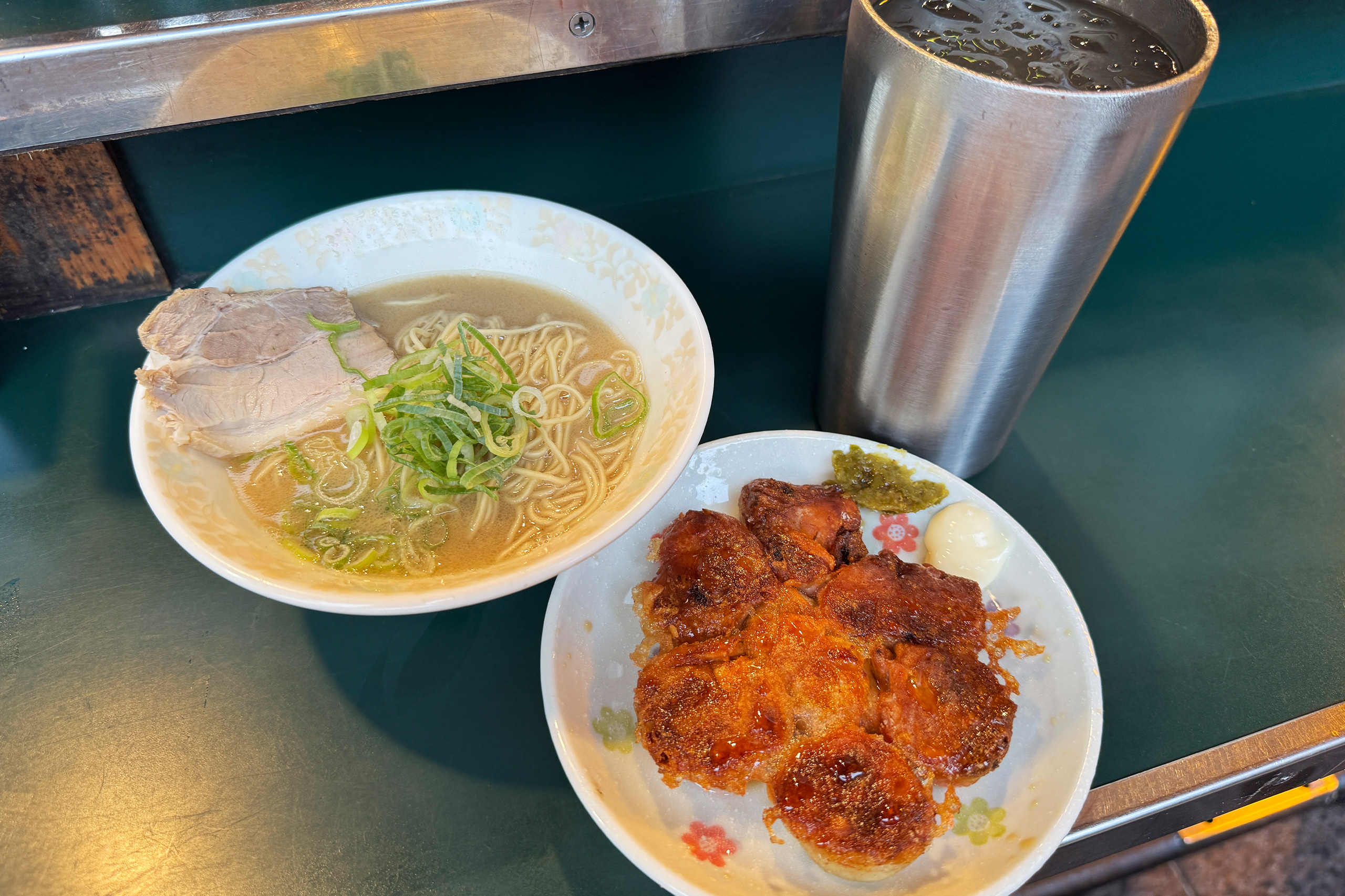 大将が「作り方は秘密だよ」と言いながら焼き上げた餃子は、訪れた人だけがわかる福岡らしい焼き方で、香ばしくもジューシーなうまみが口の中を満たします。