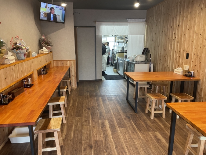 店内はカウンター4席とテーブル席2卓のコンパクトな造り。券売機で食券を購入するスタイルで、木目調の温かみある雰囲気の中、落ち着いて食事ができます。