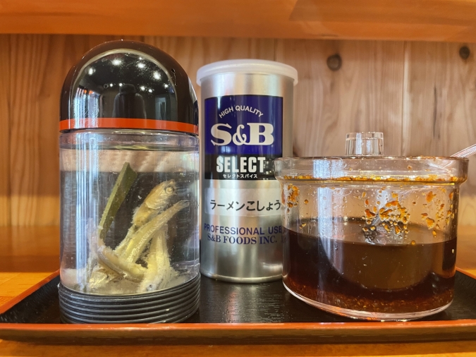 卓上には特製ラー油やお酢、ラーメンコショウが置かれ、味変を楽しむことも可能。特にいりこと昆布が入ったお酢が用意されているのは珍しく、さっぱりと味わいたいときにおすすめです。