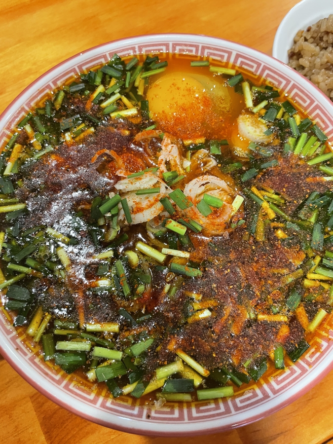 見ためからして「やばい!」って言いたくなる麻辣担々麺(マーラータンタンメン)。挽肉入りの真っ赤なスープにラー油がたっぷり浮かんでいて、ニラとネギの色合いも食欲をそそります。『生卵』(150円)はおすすめトッピングということでお願いしました。