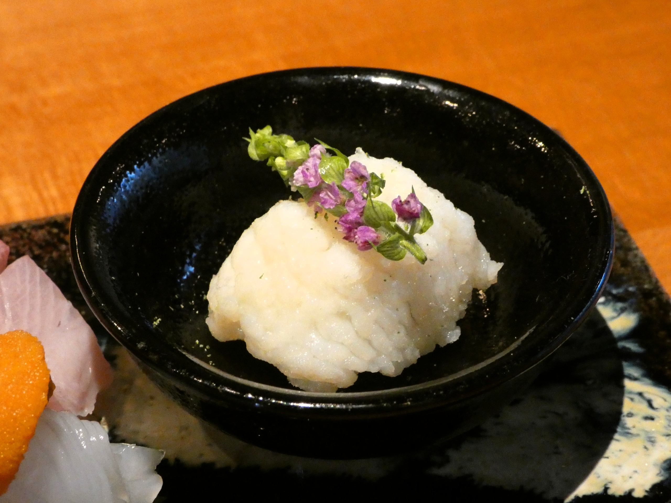 旬の鮮魚6〜7種類を盛り合わせた人気メニューで、内容は仕入れによって変わります。この日は写真左から、長崎県産のやいとがつお、唐津産クエの炙り、対馬産の天然カンパチ、生本マグロ、アジ、アオリイカ、北海道産バフンウニ、大分県産ハモの湯引きでした。