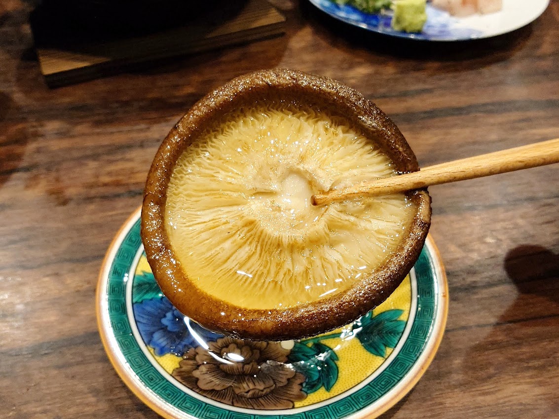 『肉厚椎茸』(418円)は、まるでお肉のような分厚さ! 炉端の熱でじっくり火を通すことで、外は香ばしく、中は驚くほどジューシーに仕上がります。かぶりついた瞬間のプリッとした弾力と、口いっぱいに広がる旨味は格別です。