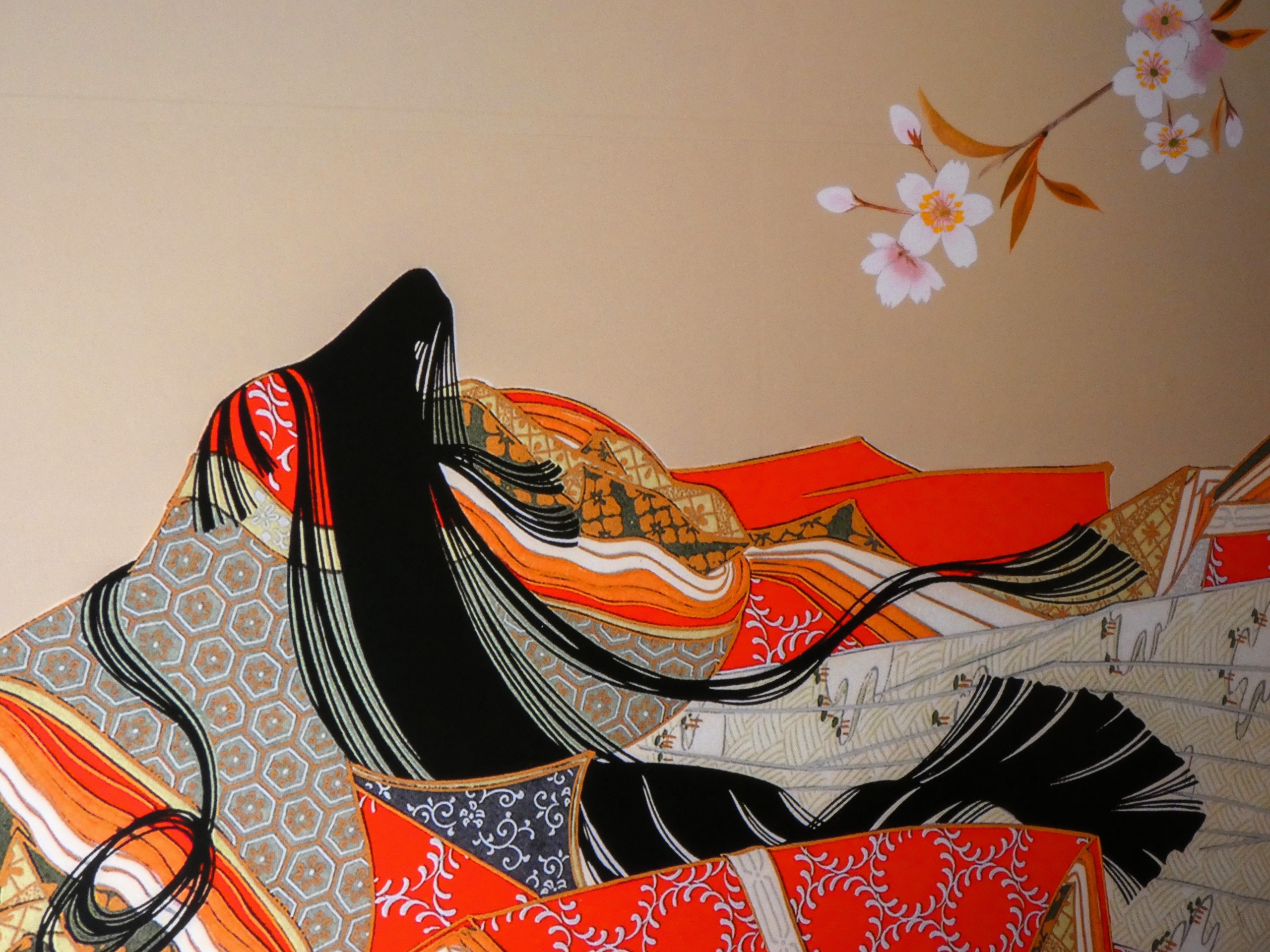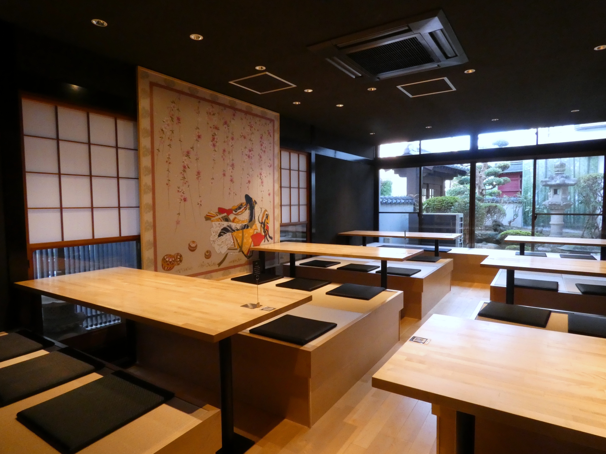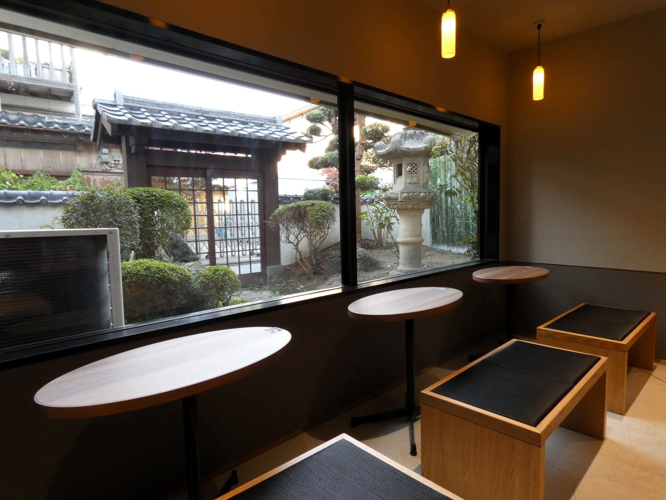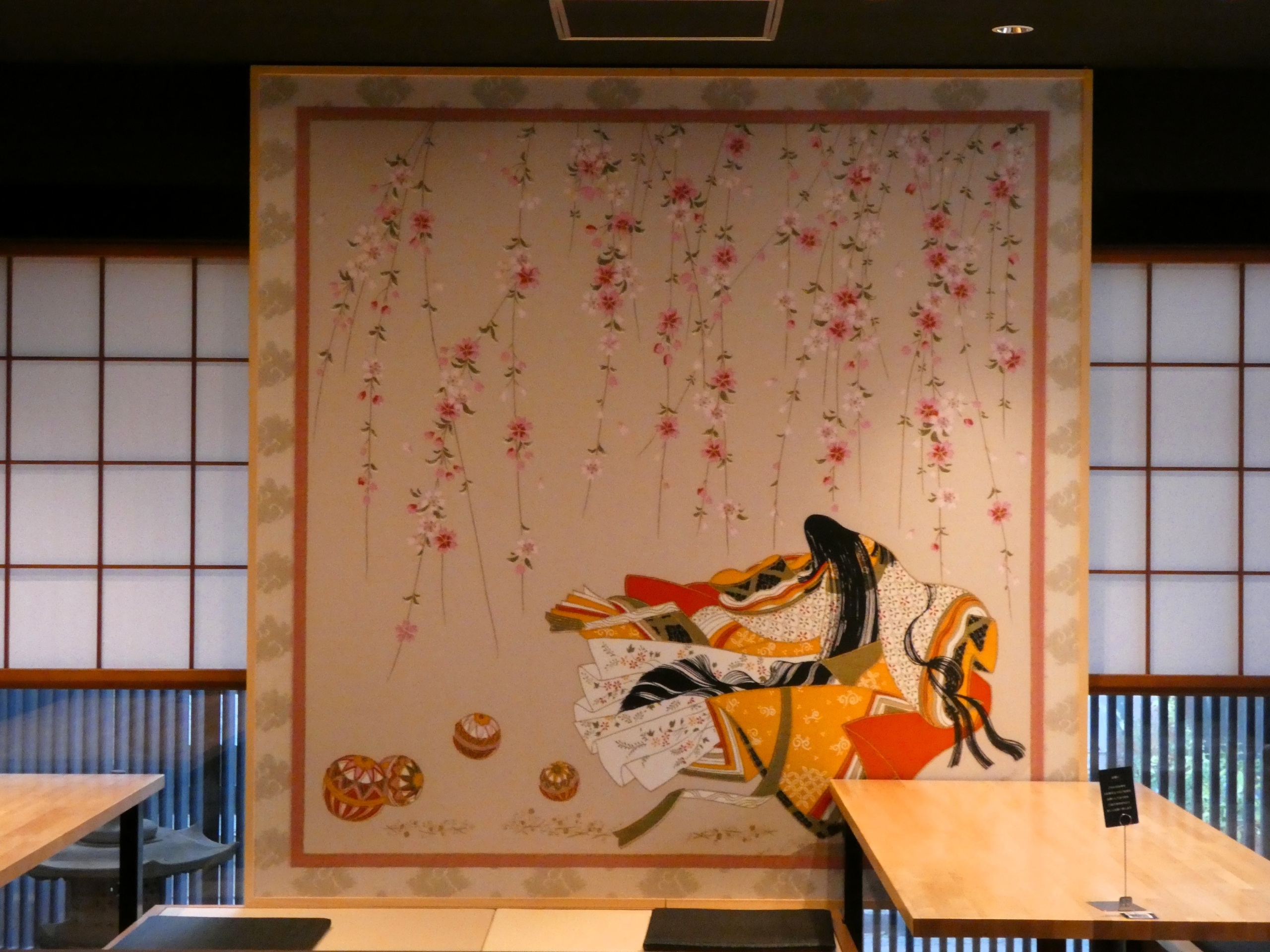 『太宰府参道店』には、インパクトのある紫式部の絵や、畳張りの落ち着く空間、日本庭園を眺めながら過ごせる特等席など、日本らしさを満喫できる場所も! 写真映えもばっちりです。