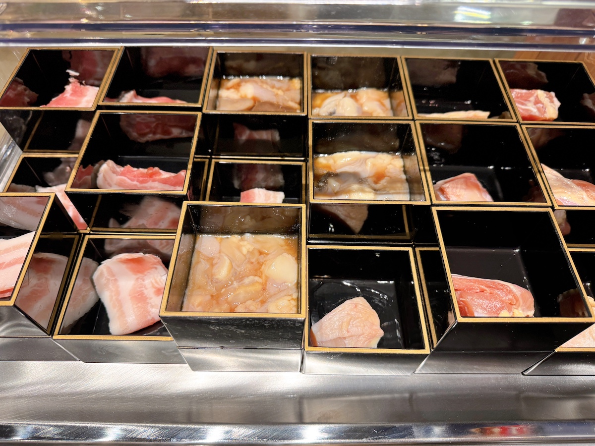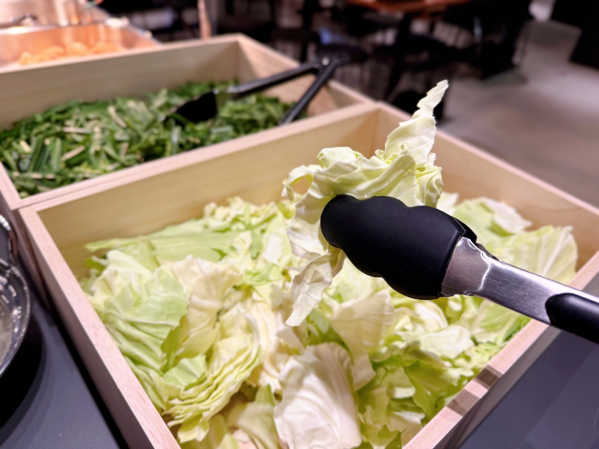 もつやお肉、キャベツやニラなどを好きなだけとって、鍋を楽しむことができます。
