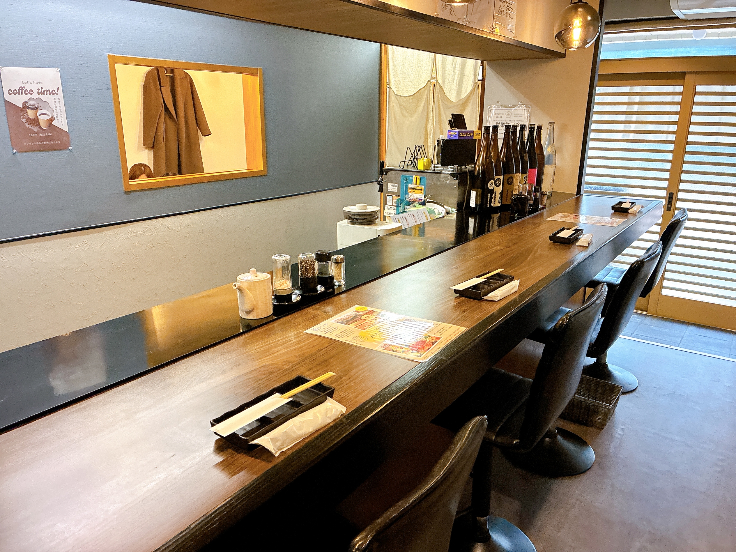 店内は清潔感があって落ち着いた雰囲気。1人でも利用しやすいカウンター席や、4~5名が座れるお座敷があり、ゆっくり食事が楽しめます。
