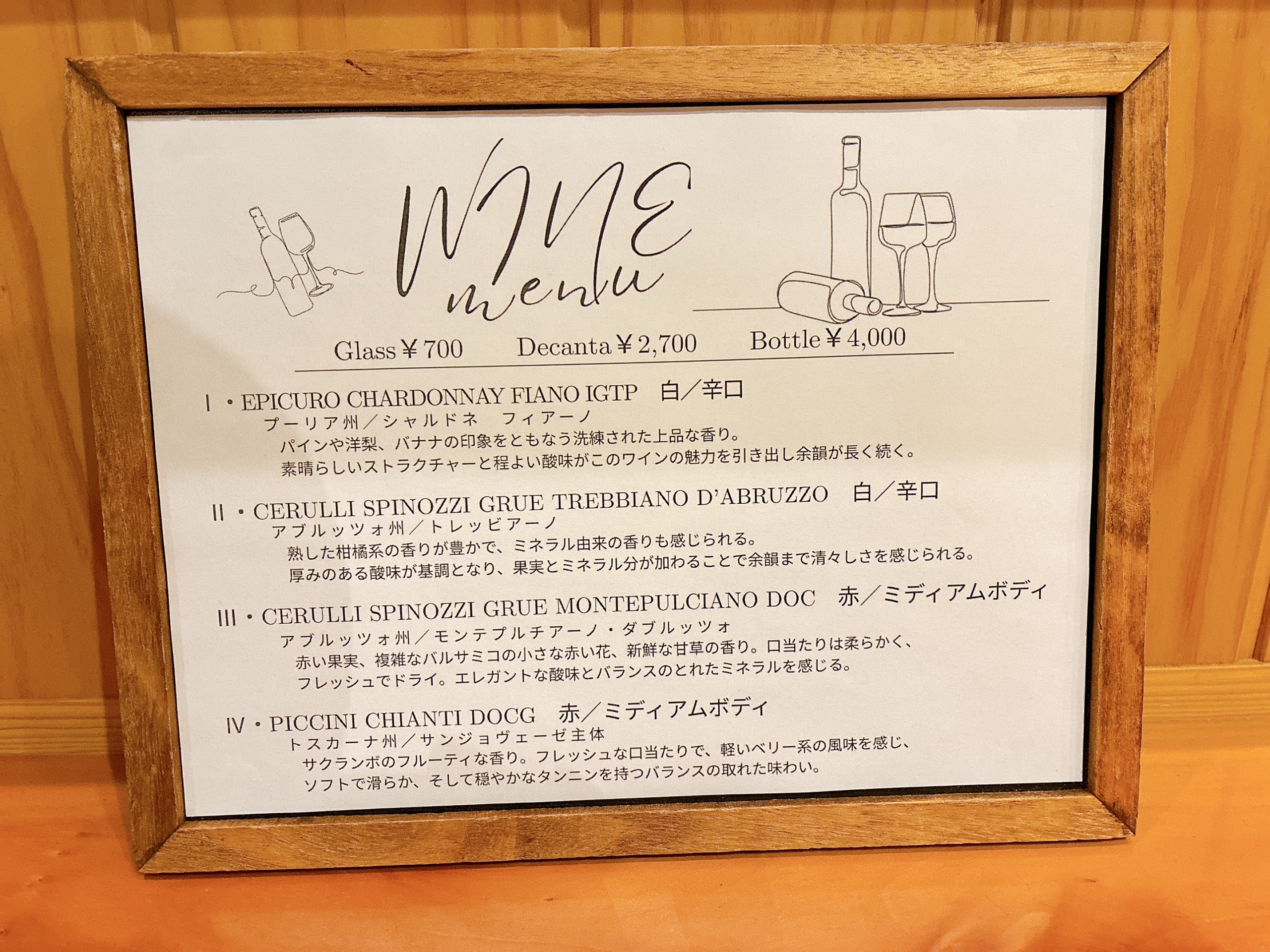 今回は、「オードブル」「サラダ」「パスタ」「魚料理」「肉料理」「ドルチェ」の全6品が楽しめる『スタンダードコース』をいただきました。