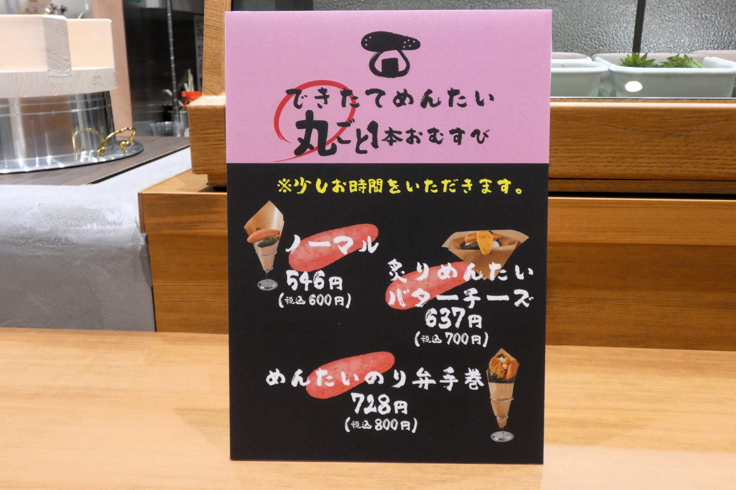 『できたてめんたいまるごと1本おむすび 炙りめんたいバターチーズ』(700円)など、工場直送のできたて明太子をまるごと1本使ったおむすびはインパクト抜群です。