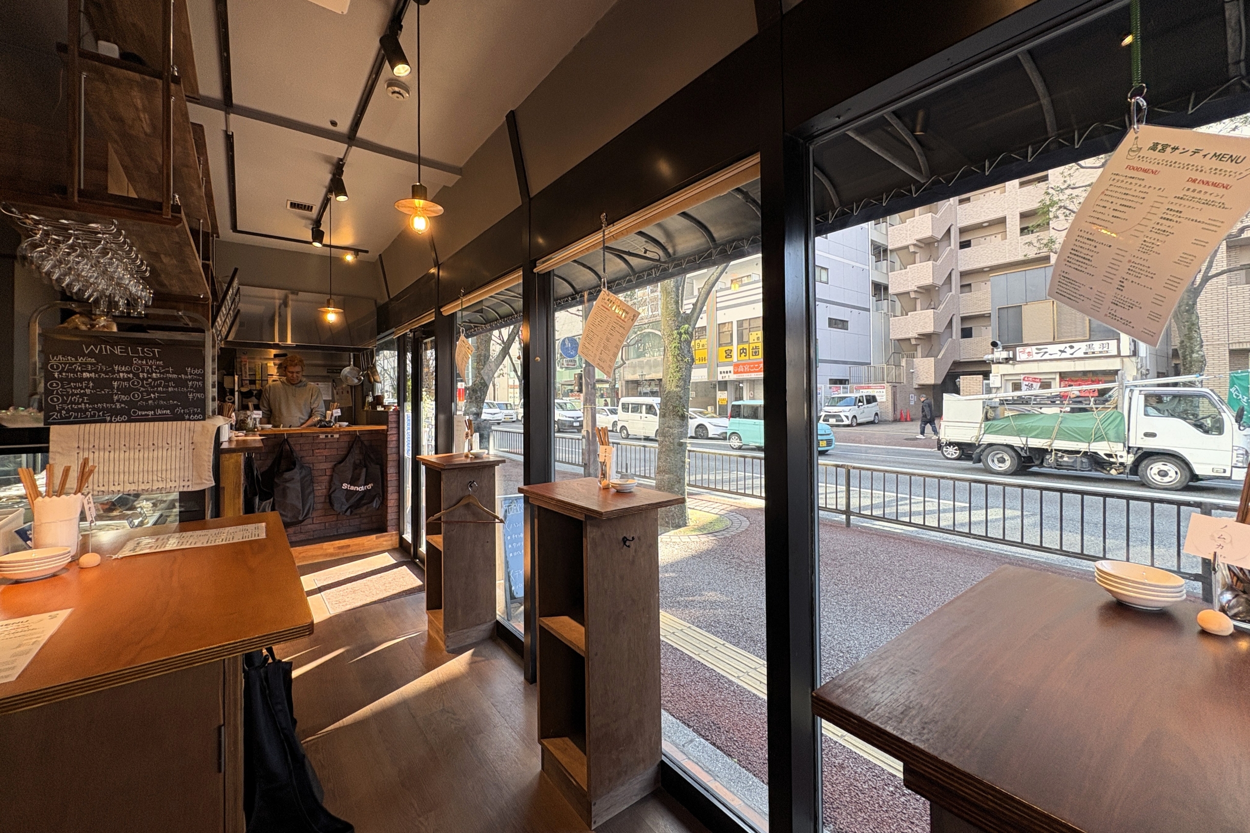 木の温もりを感じる店内は、最大で約20人ほどが利用可能。大きなガラス窓に囲まれているため、明るく開放的な空間が広がっています。