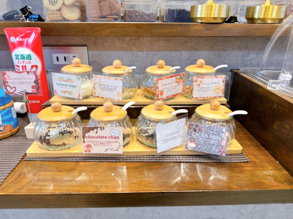 ベースは「アサイー」(900円)、濃厚な「グリークヨーグルト」(600円)、そして話題の韓国スイーツ「ヨアジョン(ヨーグルトアイス)」(750円)から選び、そこにフルーツやトッピングを自分流に盛り付けます(1g=6円)。「チョコソース」や「オレオ」「ヌテラ」「コムハニー」「カシューナッツ」「カカオニブ」などいろいろなトッピングがあります。