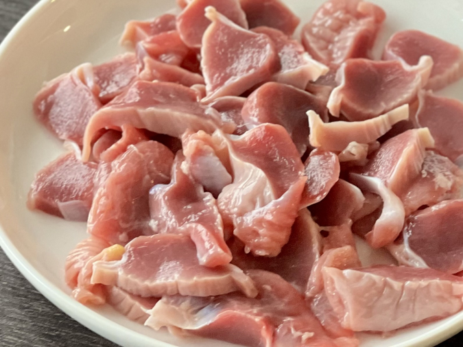 (1)新たまねぎは薄切り、ピーマン、人参は細切りにして保存容器に入れる。砂肝はつながっているものは切り離し、それぞれを4~5等分に薄切りにする。