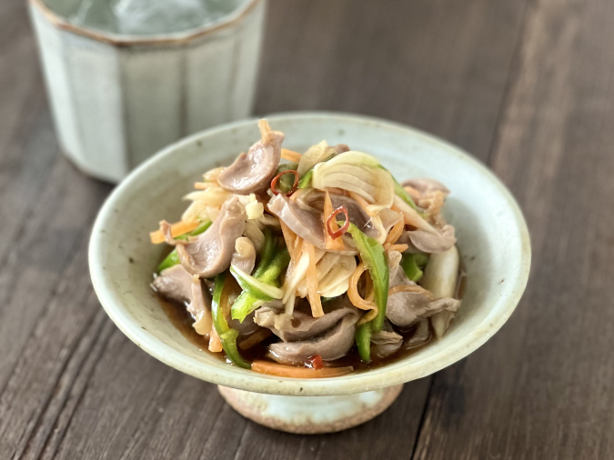新たまねぎのいいところは、切って水にさらさなくてもすぐに食べられるところですよね。今回は砂肝と南蛮漬けに。