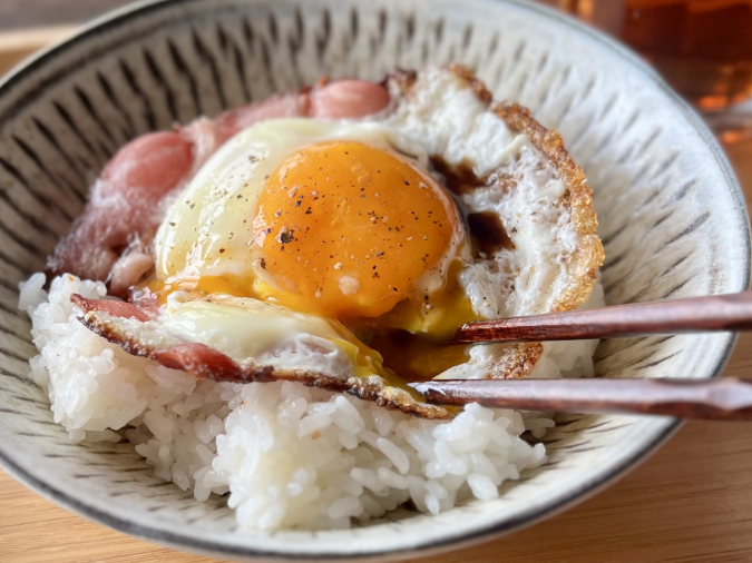 卵好きにとっては思わずニヤニヤしてしまうビジュアル。焼き方ひとつで、ベーコンも白身もカリッと仕上げることができますよ。