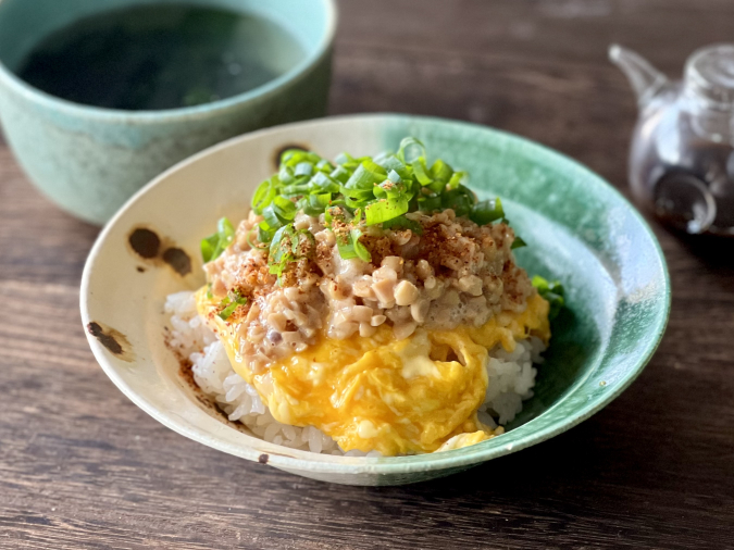(4)(2)の上にスクランブルエッグ、納豆をのせ、青ねぎを散らす。