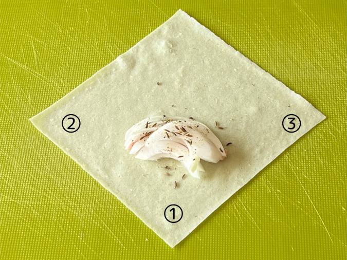 (2)春巻きの皮のざらざらしたほうを内側にして、中央より気持ち少し下に、ハム、新たまねぎ(15g程度)の順にのせて、クミンシード、ブラックペッパー少々をふりかける。