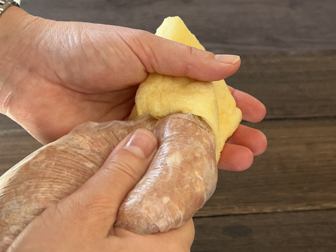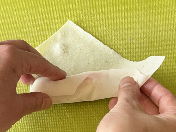 (3)上の写真1の部分の皮を具に被せて空気を抜いてキュッと巻いたら、両側の皮2・3を内側に折り畳み、上部の皮の端に(1)ののりをつけて留める。