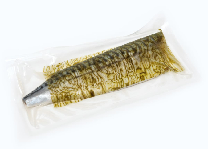 酢〆されたサバのフィレが1枚ずつ真空パックになっていて、「おぼろ昆布」という薄い昆布シートがフィレの皮側に貼り付けてあるのが特徴です。